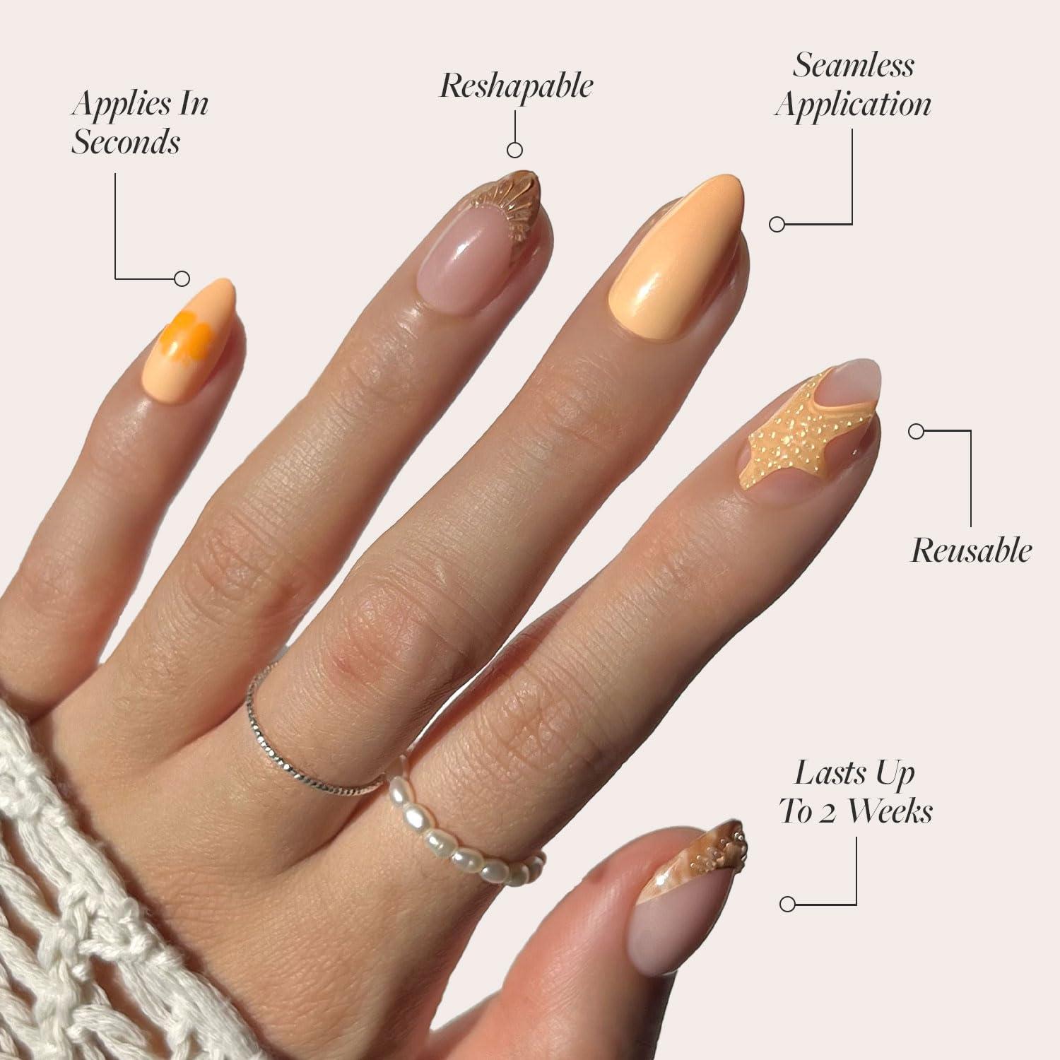 Gentle On The Hands – Soak hands in warm water for 10 minutes for an easy removal, and gently lift press-on nails from the side. Remove excess glue with a nail buffer, and store for reuse.