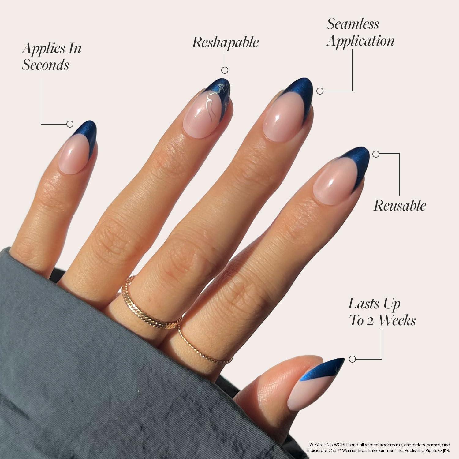 Officially Licensed HARRY POTTER Nail: A nude-to-gray velvet fade and subtle rose-gold house motifs define this short oval set, clever and refined as the legacy of Ravenclaw herself.