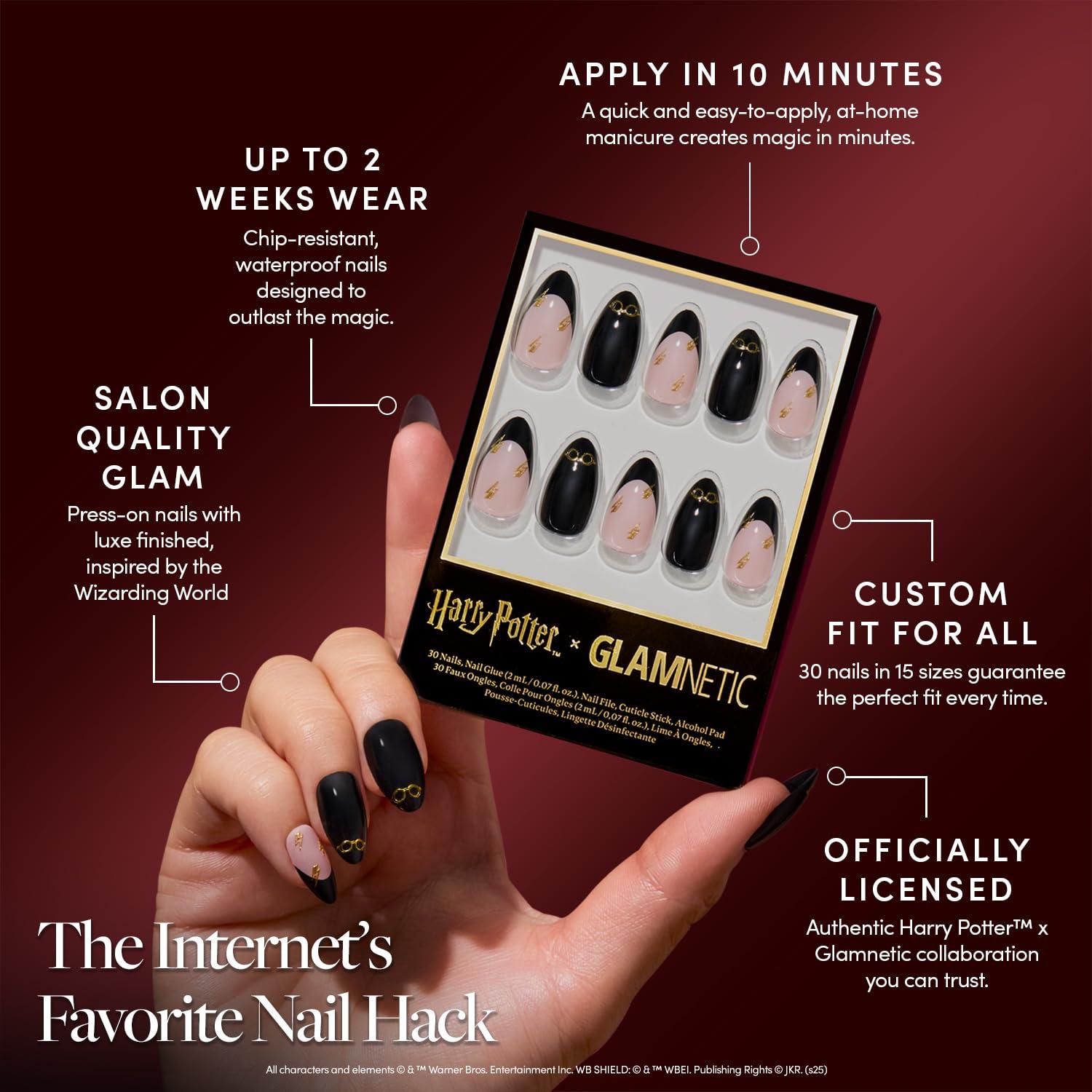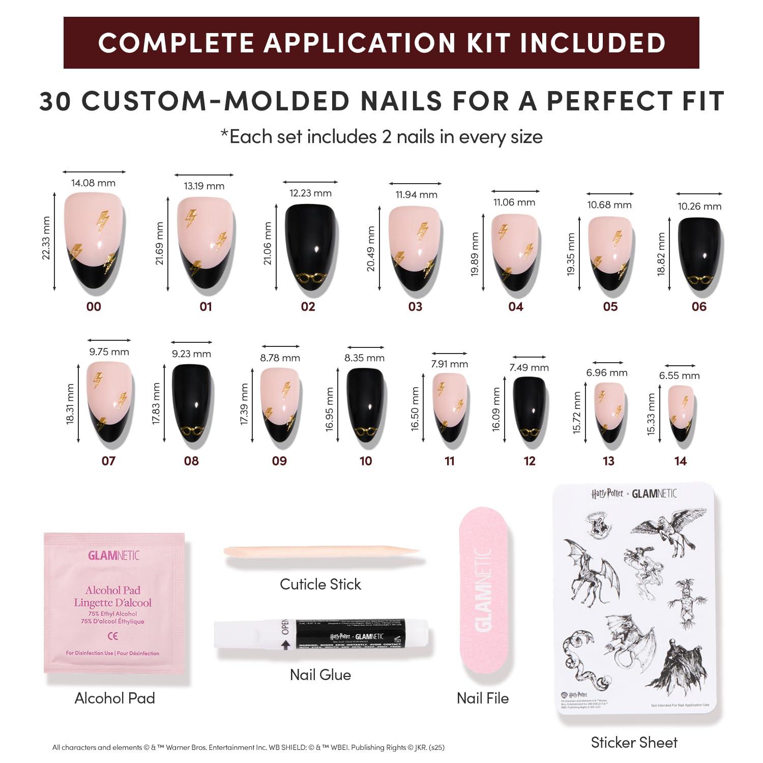 Easy 10-Minute Application: Kit includes nail glue, cuticle stick, alcohol pad, nail file, plus a ‘magical creatures’ sticker sheet exclusive to the Harry Potter x Glamnetic collection.